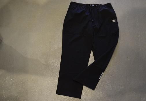 イージーパンツのアプローチであるが、ワタリから裾にかけてストンと綺麗に落ちるシルエットはトラウザーズ式パターンによるもの。負荷がかかる部分には別生地を配置し、程よいアクセントとしてデザインされている。裾を折った時のポイントにロゴ刺繍。スニーカーからサンダルまで幅広いコーディネートに対応。