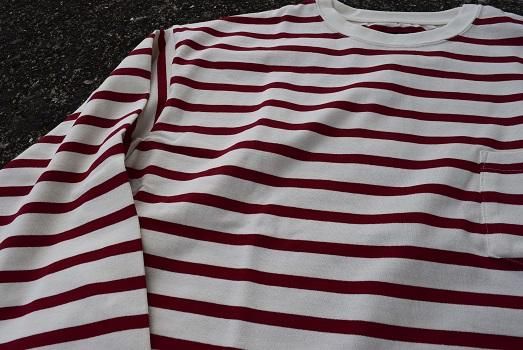 24/- の特殊紡績したドライタッチな糸を引きそろえ、ハイゲージで編立てしたボーダー素材で、ハリ感やシャリ感を味わえるドライタッチで清涼感のある風合いにしっかりとした肉感。肩幅、身幅、袖幅にゆとりを持たせたシルエット