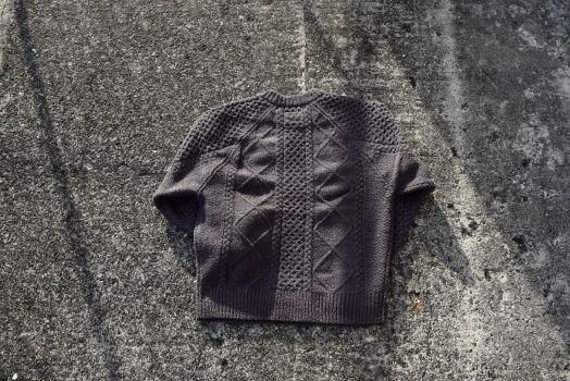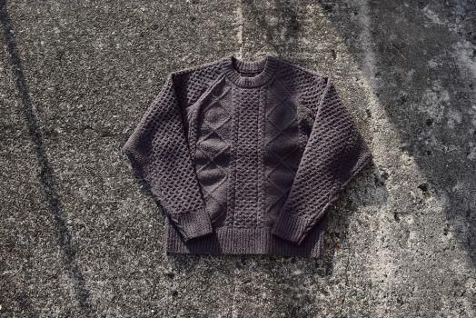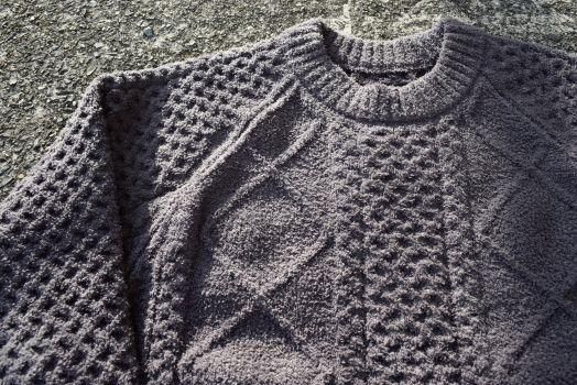 •重くて硬いフィッシャーマンニットを軽くてソフトなシャギーヤーン糸でケーブル編みを表現したMAGIC NUMBER らしい1 着。